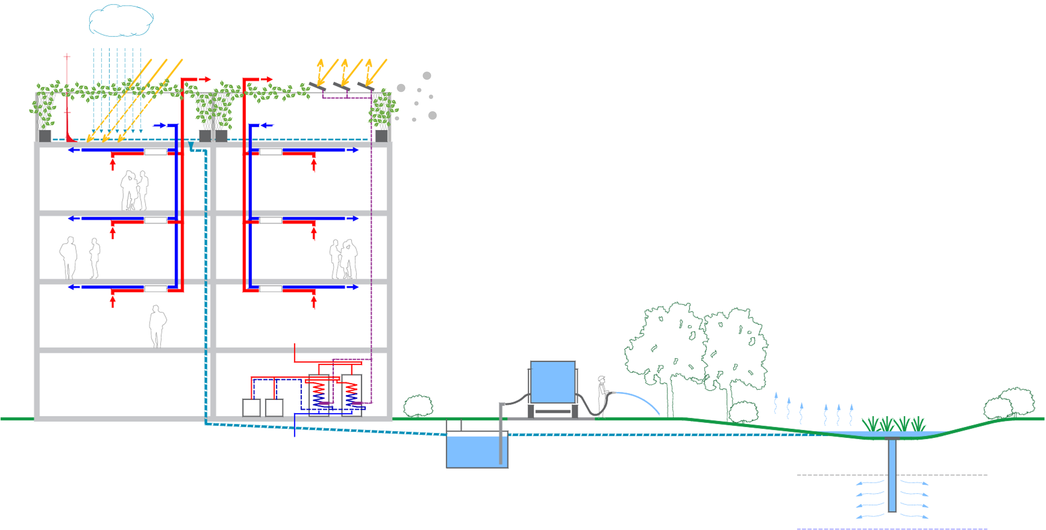 Zrážková voda ako zdroj: Dážď, ktorý spadne na rastliny a konštrukciu, je zachytávaný a uskladňovaný do špeciálnych nádrží, známych ako dážďové nadrže. Táto voda sa následne môže využiť napríklad na polievanie rastlín, čím sa šetria prírodné zdroje a podporuje udržateľné hospodárenie.